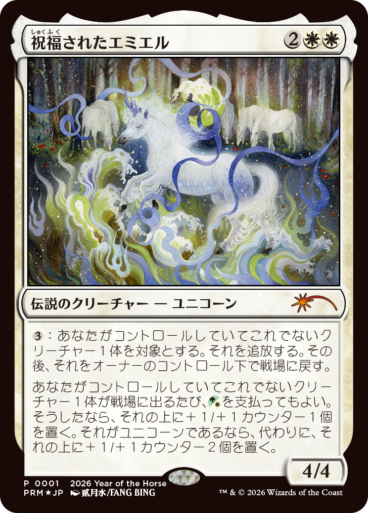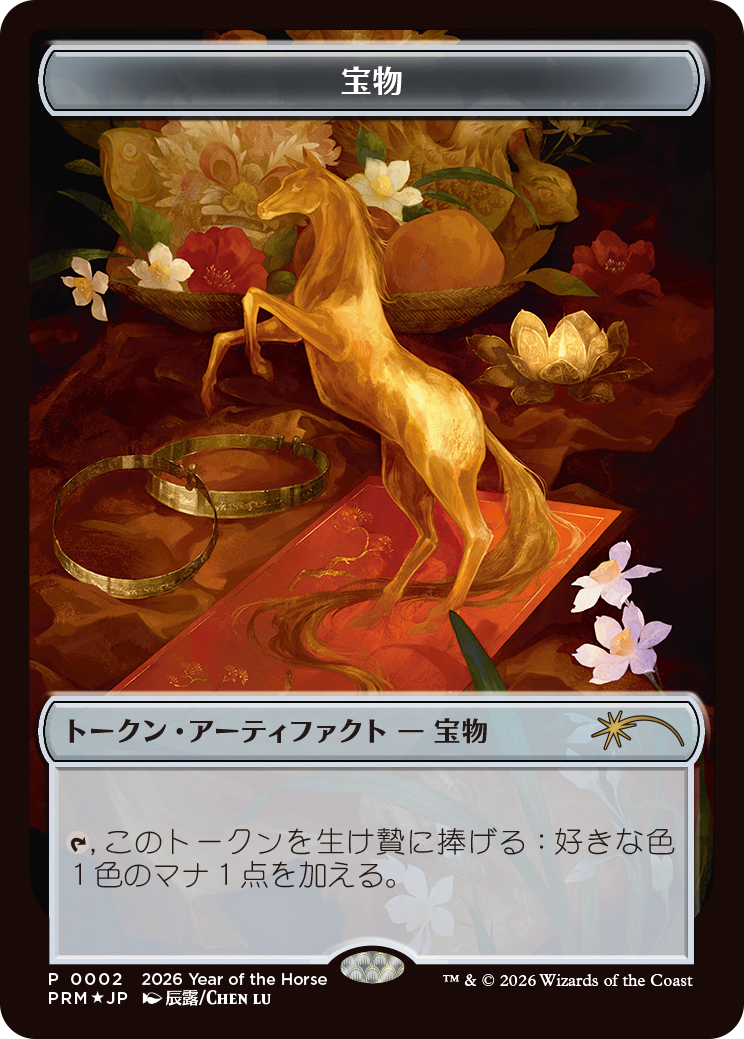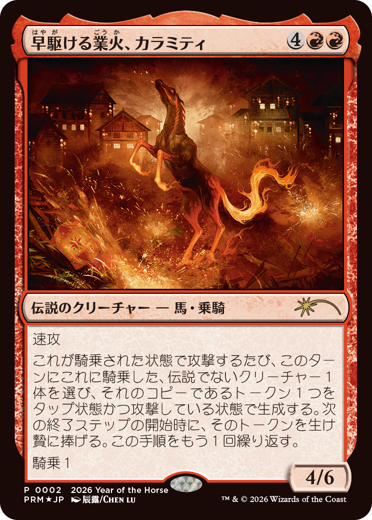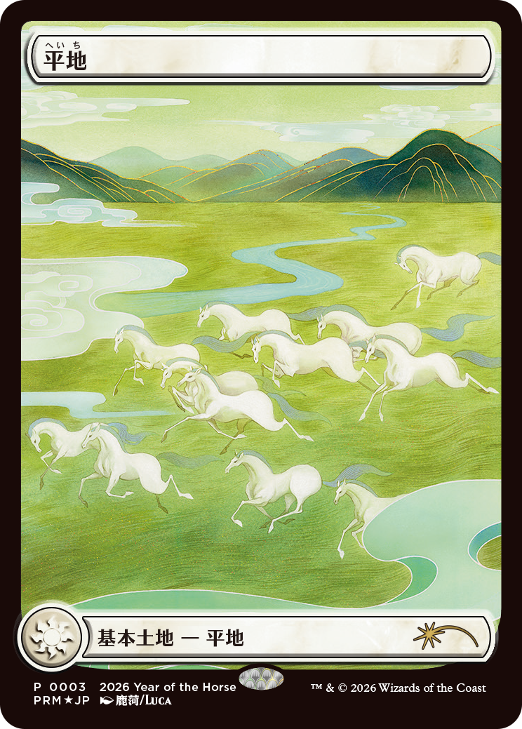 そして2026年4月からのマジック・リーグにて同月内でそれぞれ別日に2回対戦を行っていただくたび、以下のプロモカードを期間ごとにプレゼント!定番の干支プロモシリーズより、今回はフォイル仕様の「午年プロモ」を進呈しちゃいますよ!(プロモカードの配布枚数には限りがございます。あらかじめご了承ください)