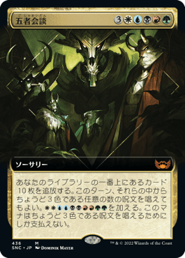 - このセットは弧3色に焦点を当てているので、心躍る多色カードは3色にしたかった。なお、セット内唯一の5色カード、《五者会談》は3色テーマに焦点を当てたものである。
