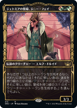 この混成サイクルをどのように作ったか見ていこう。《ジェトミアの情婦、ジニー・フェイ》を例として取り上げる。各カードのコストはちょうど3マナである。その陣営の中心色が中心のマナとなる。《ジェトミアの情婦、ジニー・フェイ》の場合、舞台座一家なので緑である。1つ目と3つ目のマナ・シンボルは、中心色と、その陣営の他の2色それぞれの混成マナ・シンボルである。この色は、混成マナを書く上では、中心色は緑マナ・シンボルに隣接した側に置かれる。《ジェトミアの情婦、ジニー・フェイ》の場合、1つ目のシンボルが赤緑混成、3つ目のシンボルが緑白混成になる。