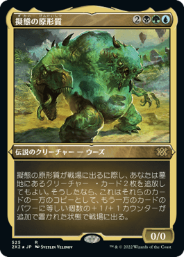 ムラガンダはその後、初代『プレインチェイス』で《餌場》の次元で登場している。その後、『統率者(2011年版)』で、クリーチャー《擬態の原形質》でも登場した。これらを踏まえてこのカードを作ることになる。恐竜やウーズがいる前史時代の次元は緑っぽいので、そこから始めた。