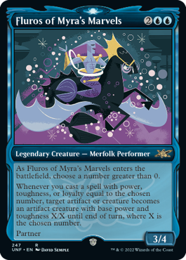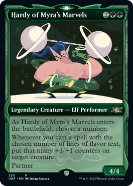 これらのデザインを駆け足に進めているのは、最近取り上げられ始めたからである。『Unfinity』は、「数を選ぶ」カードが2枚ある初のセットである。(『エルドレインの森』が2つ目だ。)マイラの超人サイクルには、通常のセットでは参照することがないようなカードの様々な麺を参照した基柱となるクリーチャーが含まれている。フルロスはカードのどこかに特定の数があることを、ハーディはフレイバー・テキストの行数を、それぞれ参照している。
