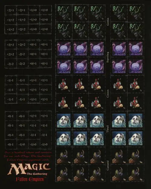 このセットが出るまでは、トークンは特定のカードで使われるデザイン上のツールにすぎなかった。『フォールン・エンパイア』は、トークン(とカウンター)をセットの中心的なメカニズムとして扱った初めてのセットである。まだ固有の名前を持つ「トークン・メカニズム」は存在していなかったが(それは後に登場した)、各色がそれぞれ独自のトークン生成手段を持っていた。トークンで埋め尽くされた戦場というゲームプレイは、このセットを特徴づける要素となった。そのため「The Duelist」誌は、史上初のトークン補助ツール――トークンやカウンターを表すための厚紙製の切り抜き型シート――を掲載したのである。