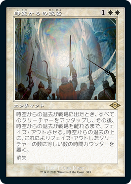 時空からの退去が戦場に出たとき、すべてのクリーチャーをアンタップし、その後、時空からの退去が戦場を離れるまで、それらのクリーチャーはフェイズ・アウトする。時空からの退去の上に、これによりフェイズ・アウトしたクリーチャーの数に等しい数の時間カウンターを置く。