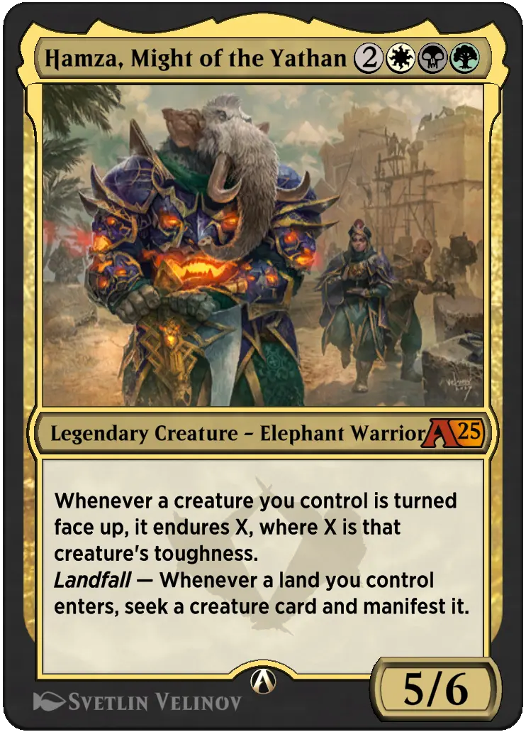 『統率者レジェンズ』初出のハムザは、力強いロクソドンです。戦いで名を上げた彼はアブザンの精鋭集団である「ヤサン」の一員となりました。ファイレクシアの侵略時にはその実力を遺憾なく発揮し、アブザンの民に寄り添い、家族への忠義を示しました。彼の次なる戦場はMTGアリーナ。アブザンの強さを示すべく、さらなる戦いに臨みます。