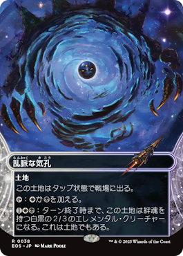 《乱脈な気孔》をはじめとするクリーチャー化する土地がこのセットで一堂に会しました。この再会を記念して、いくつかの土地――《乱脈な気孔》《忍び寄るタール坑》《風切る泥沼》《鋭い突端》《伐採地の滝》――に、同サイクルの他のカードのテンプレートにより近づけるための機能に影響しない更新が行われています。(※訳注:日本語版テンプレートではこの変更の影響を受けません。)