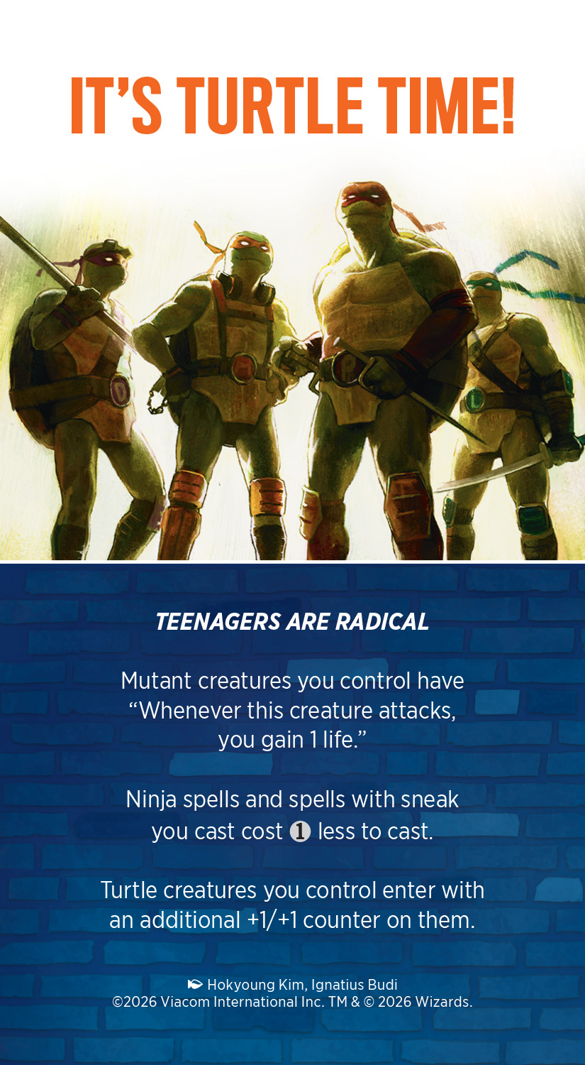 時計をタートル標準時間に合わせておいてください。お近くのゲーム店にタートル・タイムがやってきますよ!「マジック・プレゼンツ:イッツ・タートル・タイム!」は、ミュータントや忍者、海亀に恩恵をもたらす「ミュータント・タートルズ」をテーマにした特別な紋章を駆使しながら遊べるピック2・ドラフトのイベントです。本当はティーンエイジャーにも恩恵があればよかったのですが、(まだ)クリーチャー・タイプじゃありませんからね。