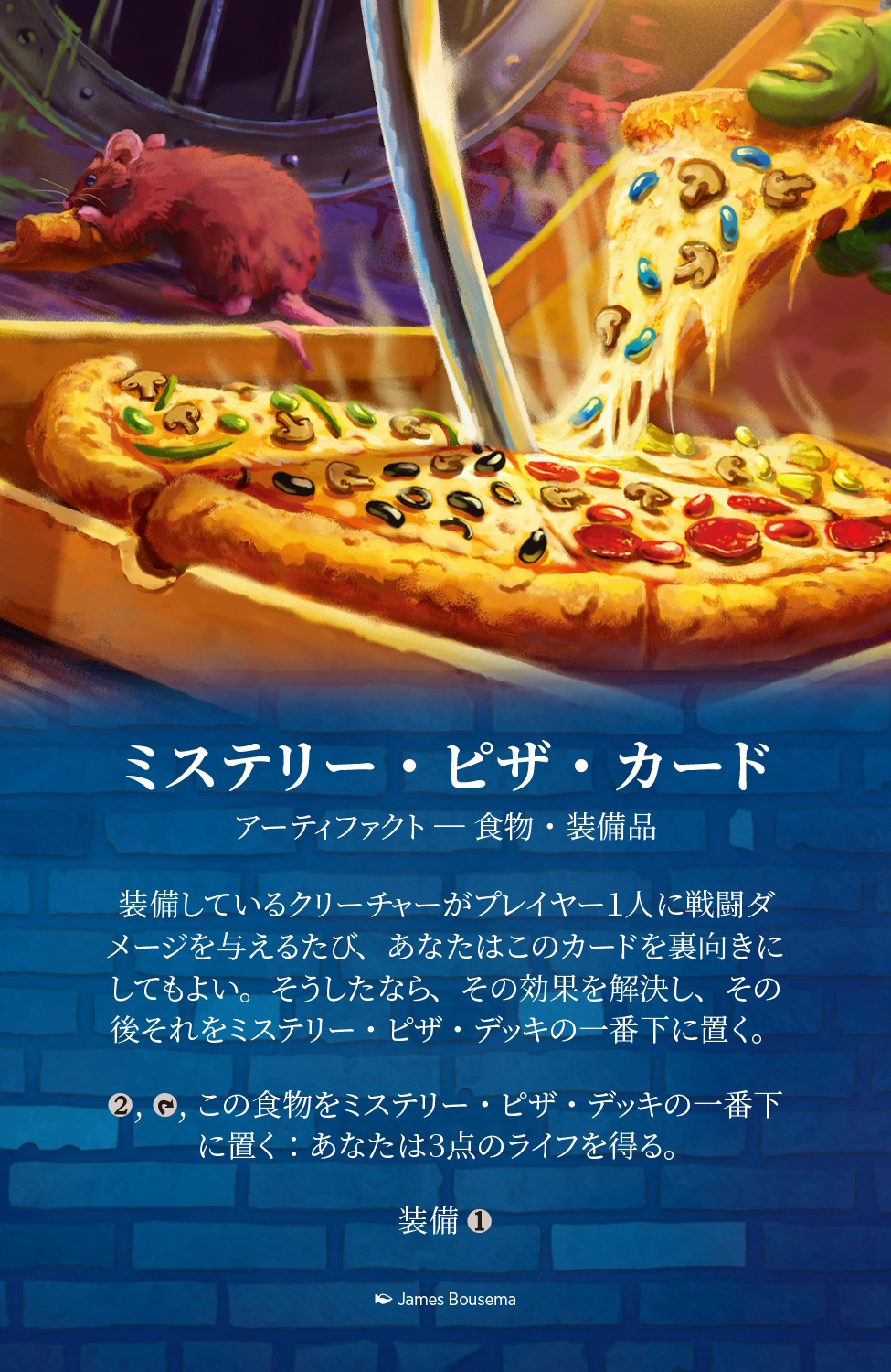 このイベントでは特別な能力がたくさん用意され、普段の統率者戦が一層味わい深くなります。各プレイヤーとも、「ミステリー・ピザ」が戦場に出ている状態でゲームが始まります。「ミステリー・ピザ」はクリーチャーに装備することができ、食べればライフを得られます!配達員になったカメが対戦相手に戦闘ダメージを与えると、フレイバー(とパワー)たっぷりの「ミステリー・ピザ・デッキ」から特別な効果が発揮されます。