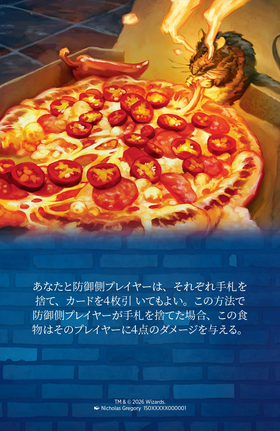 突然変異を果たした、つまりこのイベントで無敗のプレイヤーには、ファジャレカ・セティアワン/Fajareka Setiawan氏によるアートのボーダーレス版プロモカード《ピリ辛オートミールピザ》が配布されます。WPN店舗では非フォイル仕様のものが配布されますが、WPNプレミアムストアではフォイル仕様のものが配布されます。詳しくはお近くのゲーム店までお問い合わせください!