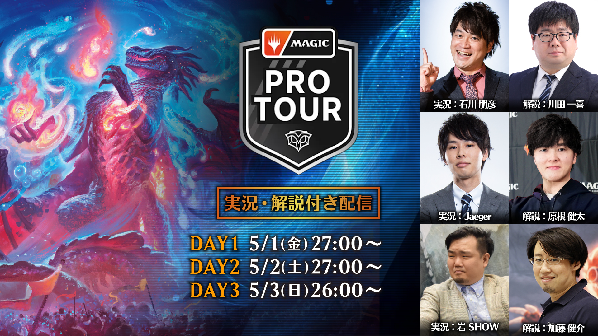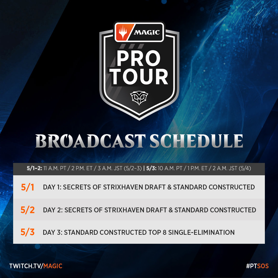 「プロツアー『ストリクスヘイヴンの秘密』」の配信はMagic.gg、twitch.tv/magic、youtube.com/@Play_MTGで各日視聴できます。