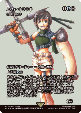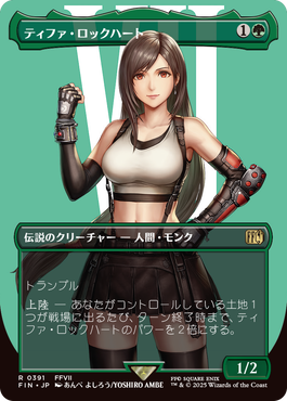 『マジック:ザ・ギャザリング――FINAL FANTASY』プレイ・ブースターおよびコレクター・ブースターからは非フォイル仕様/フォイル仕様のものが出現します。コレクター・ブースターからは、サージ・フォイル仕様のものも出現します。統率者デッキ収録カードの「キャラクター」ボーダーレス版は、非フォイル仕様/フォイル仕様ともにコレクター・ブースターから出現します。
