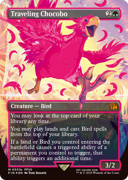 さらに《旅するチョコボ》にはボーダーレス版も用意され、すべての言語版のプレイ・ブースターおよびコレクター・ブースターから非フォイル仕様/フォイル仕様ともに出現します。
