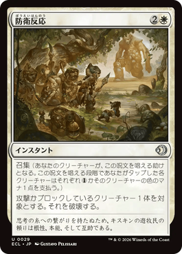 キスキン・クリーチャーたちは、戦線を横に伸ばして能力を盤面全体へ広げることを目指します。《小村の祝祭》や《ミストメドウ会議》で強固な盤面を築き、《臆病な盾持ち》の起動型能力でクリーチャーを強化しましょう。ただし無理は禁物です。《闇の帳》で負けないようご注意ください。横並べ戦略のデッキは歴史的に見ても盤面を一掃する呪文に弱いのですが、《ダンドゥーリンの織り手》のようなカードがピンチから体勢を立て直す助けになるでしょう。