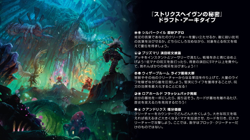 以下に『ストリクスヘイヴンの秘密』のドラフト・アーキタイプをご紹介し、それぞれのキーカードやそのアーキタイプのデッキを組む際のヒントをお届けします。いわばマジックのシラバスですね!