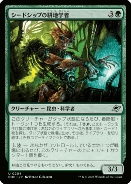 《シードシップの耕地学者》:上陸するだけで+1/+1カウンターを乗せつつ、着陸船・トークンを生成する能力でさらに自身を継続的に強化できる、一度動き出したらゲームを早々に終わらせる性能を持つ、非常に強力なクリーチャーです。